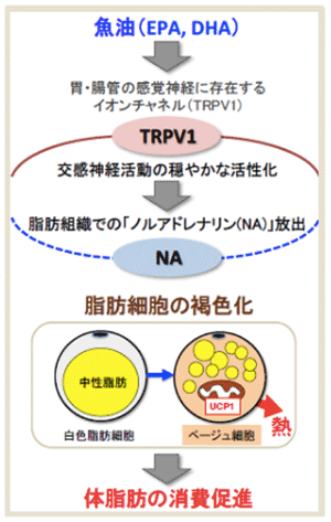 京都大学から2015年12月17日付「Scientific Reports」に、EPAやDHAを含む魚油の摂取が脂肪細胞の一種である「褐色脂肪細胞」の増加を促し、体脂肪の減少や体温上昇をもたらすことを動物実験の結果から、そのメカニズムが発表されました。